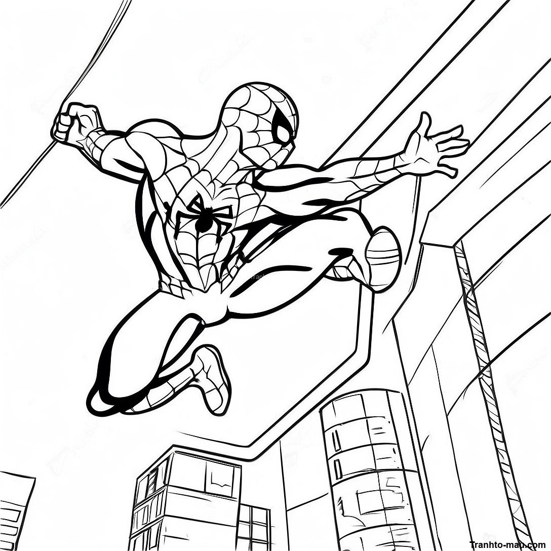 Trang tô màu Người Nhện đu đưa qua thành phố